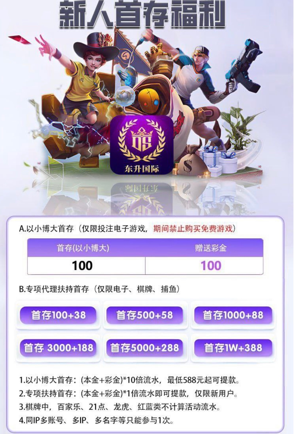 首存100+38、 首存500+58 首存1000+88、 首存3000+188、 首存5000+288 首存活动只限新用户参与,充值+彩金一倍流水即可出款 (首存本+彩的1倍流水;只计算电子、棋牌、捕鱼)