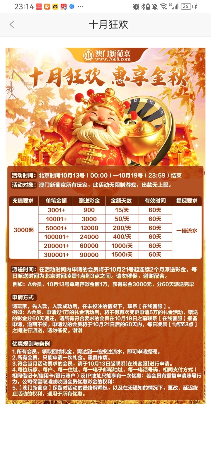 十月狂欢彩金国庆到13号充值够的可以申请报备
