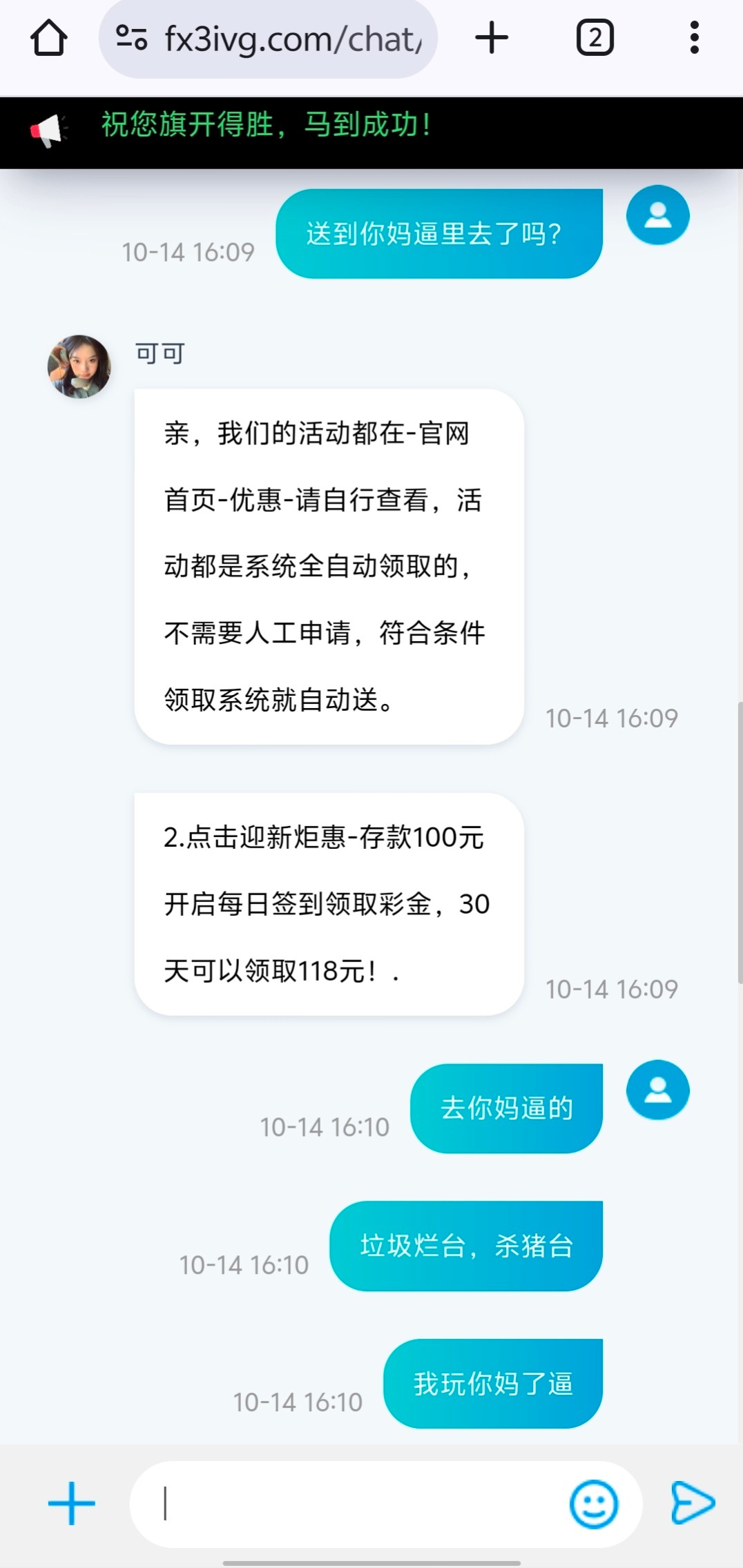 傻逼贱客服打电话过来说充100送118,结果充值了之后半天没送直接去玩pg跟假的一样100空98次直接鲨完我操你妈逼的野鸡烂平台黑台银河国际72991垃圾野鸡台套路充值