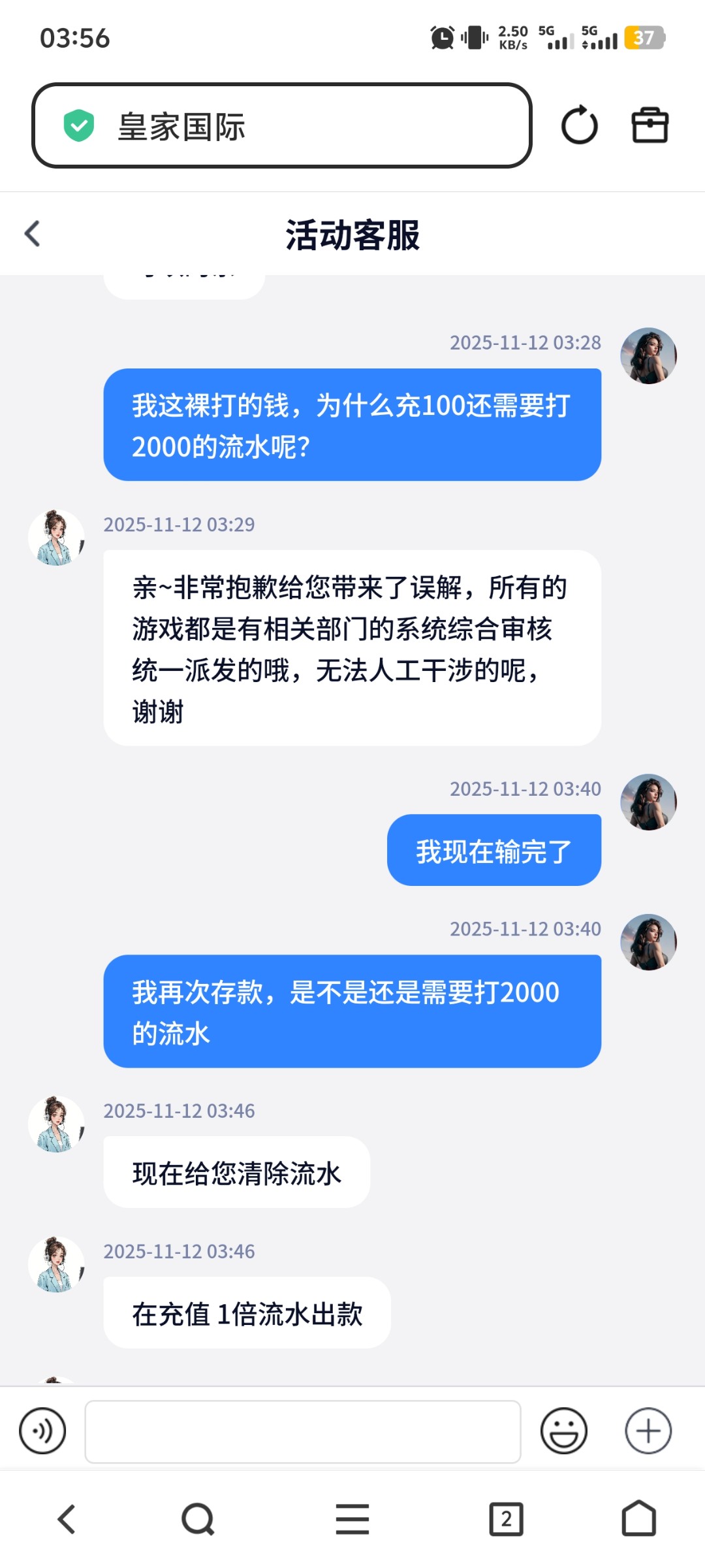 我白天打的100+100,然后输完了。晚上充了100块打到300准备提现,跟我说,我还差1500的流水,我去找客服清流水,客服不给我清,跟我说他干预不了,当初保时捷打返现100+100也输了,第二次充100赢了,然后找客服清流水,客服二话不说就给我清了,找这个逼平台客服,他妈说啥就是不给我清,他就说他清不了没有那个权限,那我也没办法,只能继续打了,300块打了最多400的流水就输完了,然后我去问他我现在再充值100是不是还需要打1000的流水,他说不用,现在可以清了,我真日了他妈妈了,几把safex交流群发的一个白菜网,进去看到这个台子就去打了,避雷这个什么傻逼白菜,他妈什么傻逼台都往出发